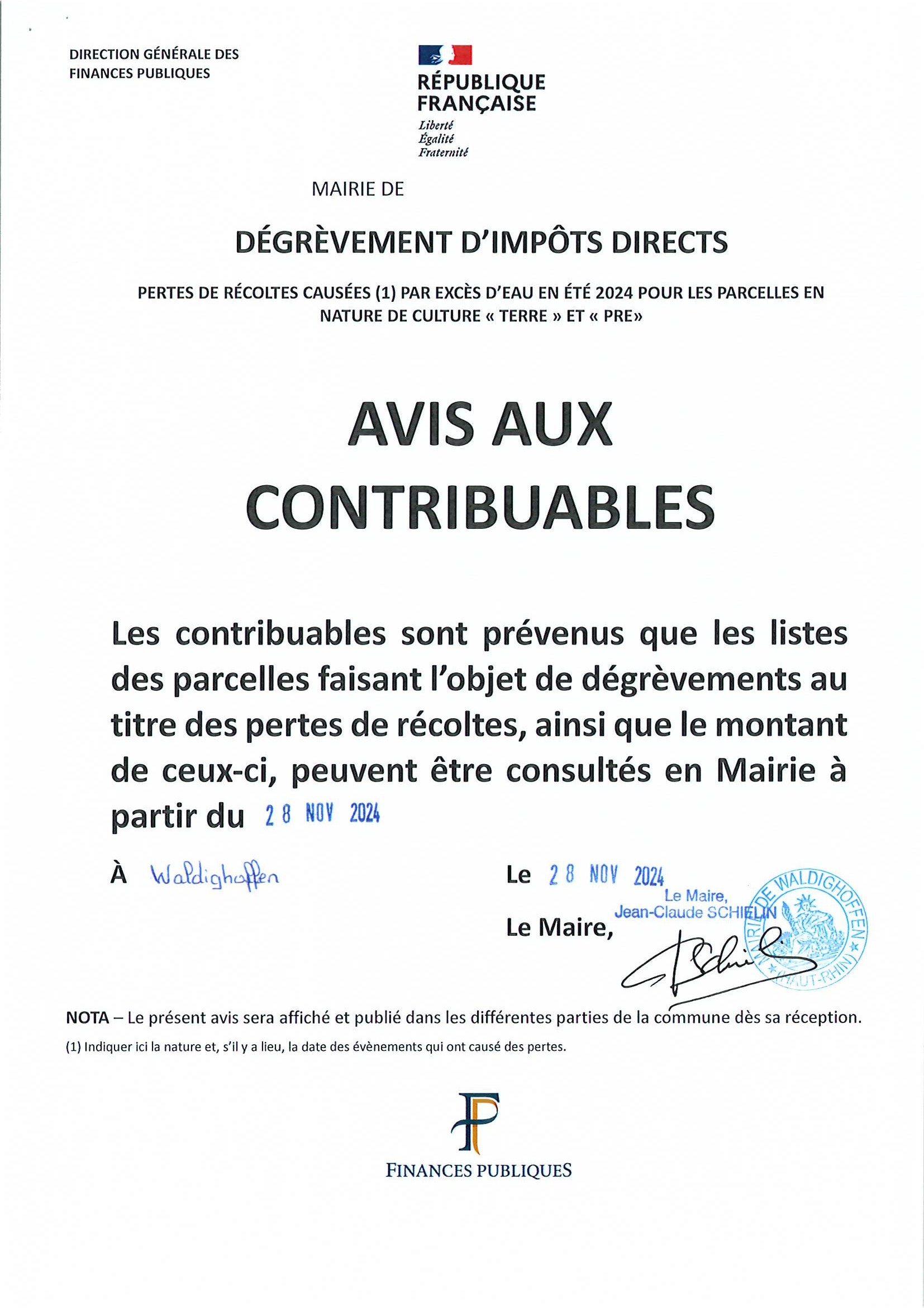 Vous êtes ici : Accueil Mairie Affichage public Annexes affichage public 2023 et 2024 Avis aux contribuables. Dégrèvement pour pertes de récoltes.