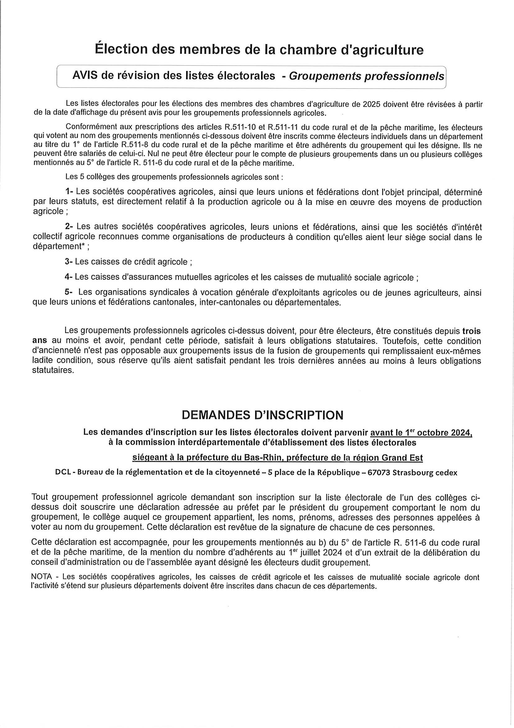 Avis de révision des listes électorales - Groupements professionnels