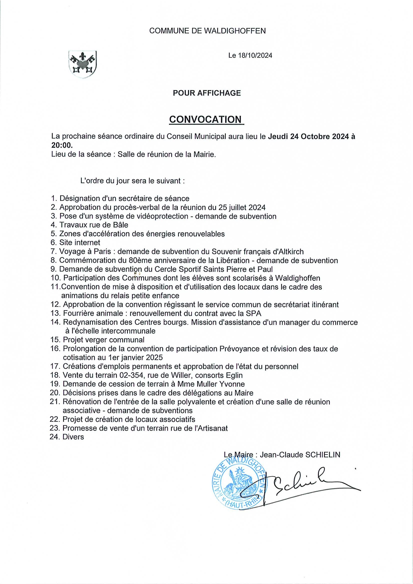 Convocation à la réunion du conseil municipal du 24/10/2024