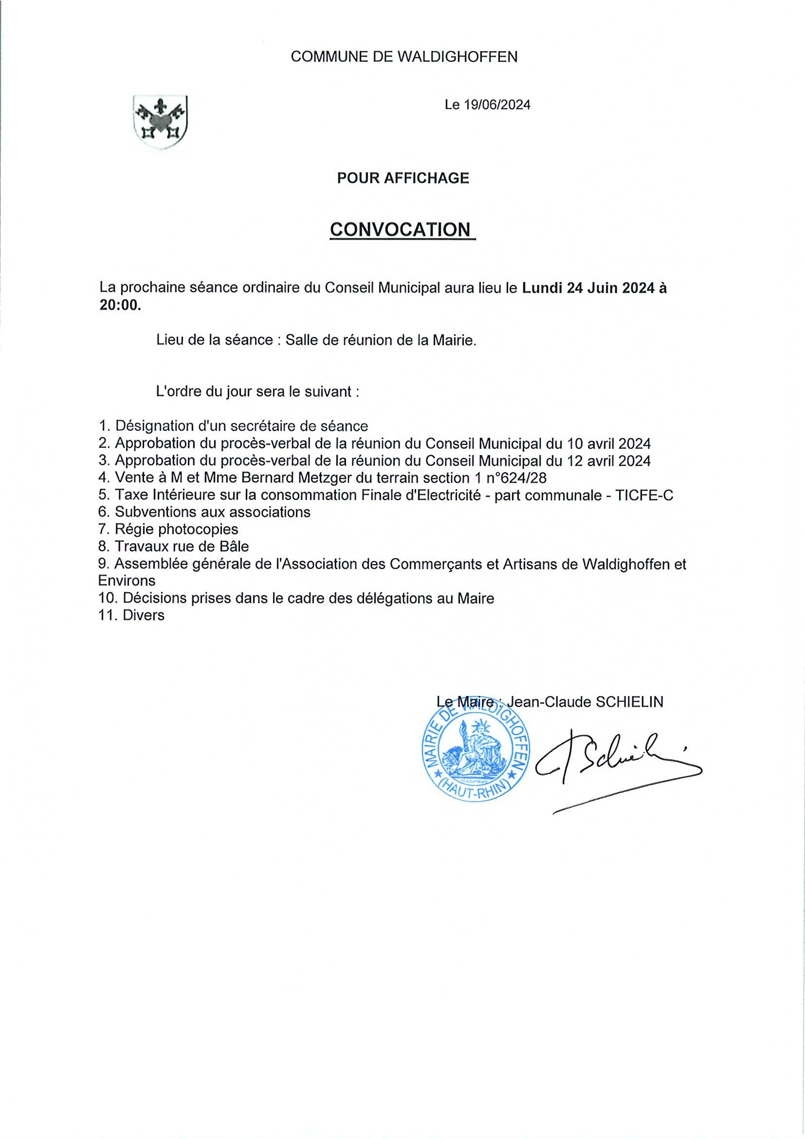 Convocation à la réunion du conseil municipal du 24 juin 2024