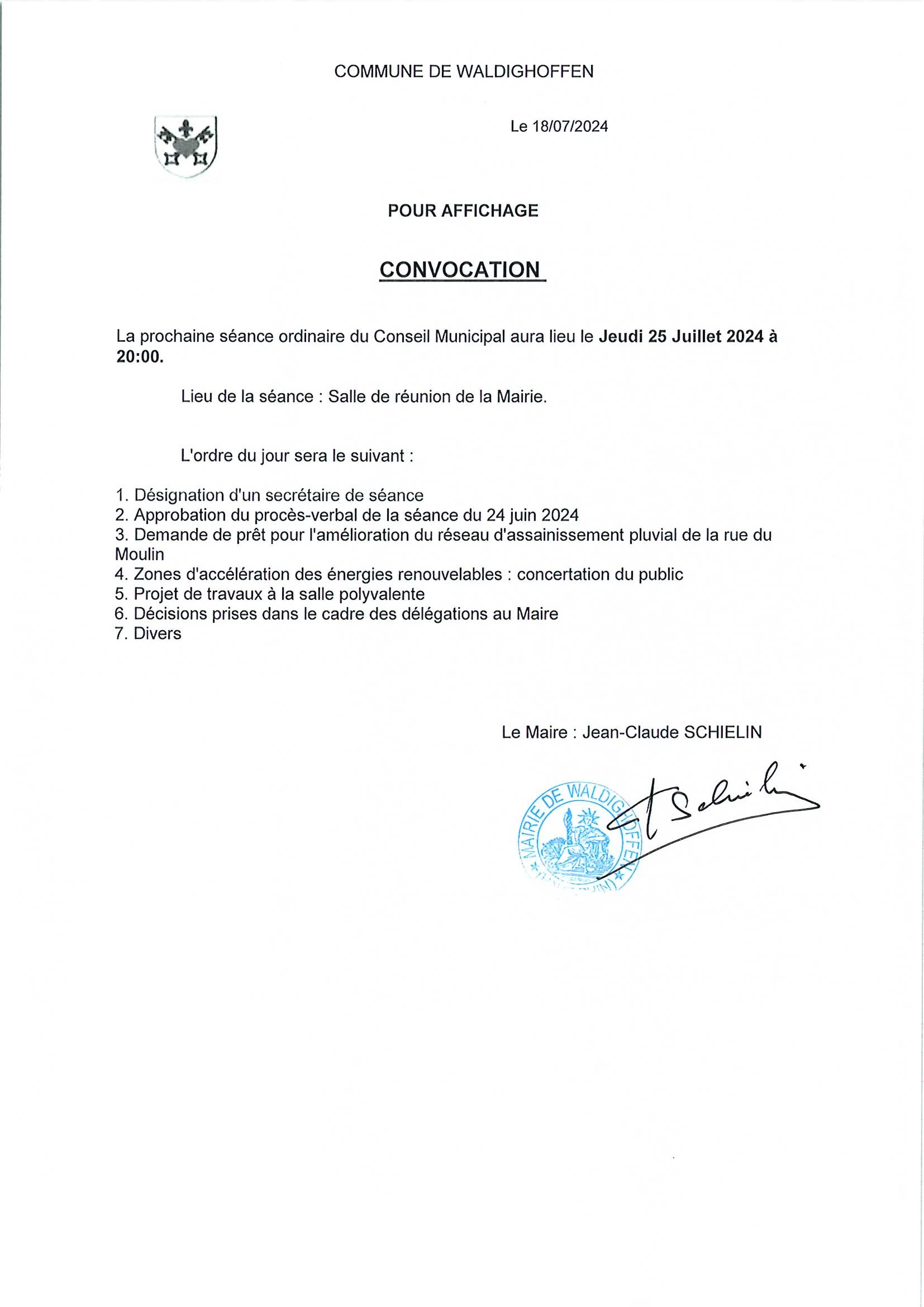 Convocation à la réunion du conseil municipal du 25/07/2024