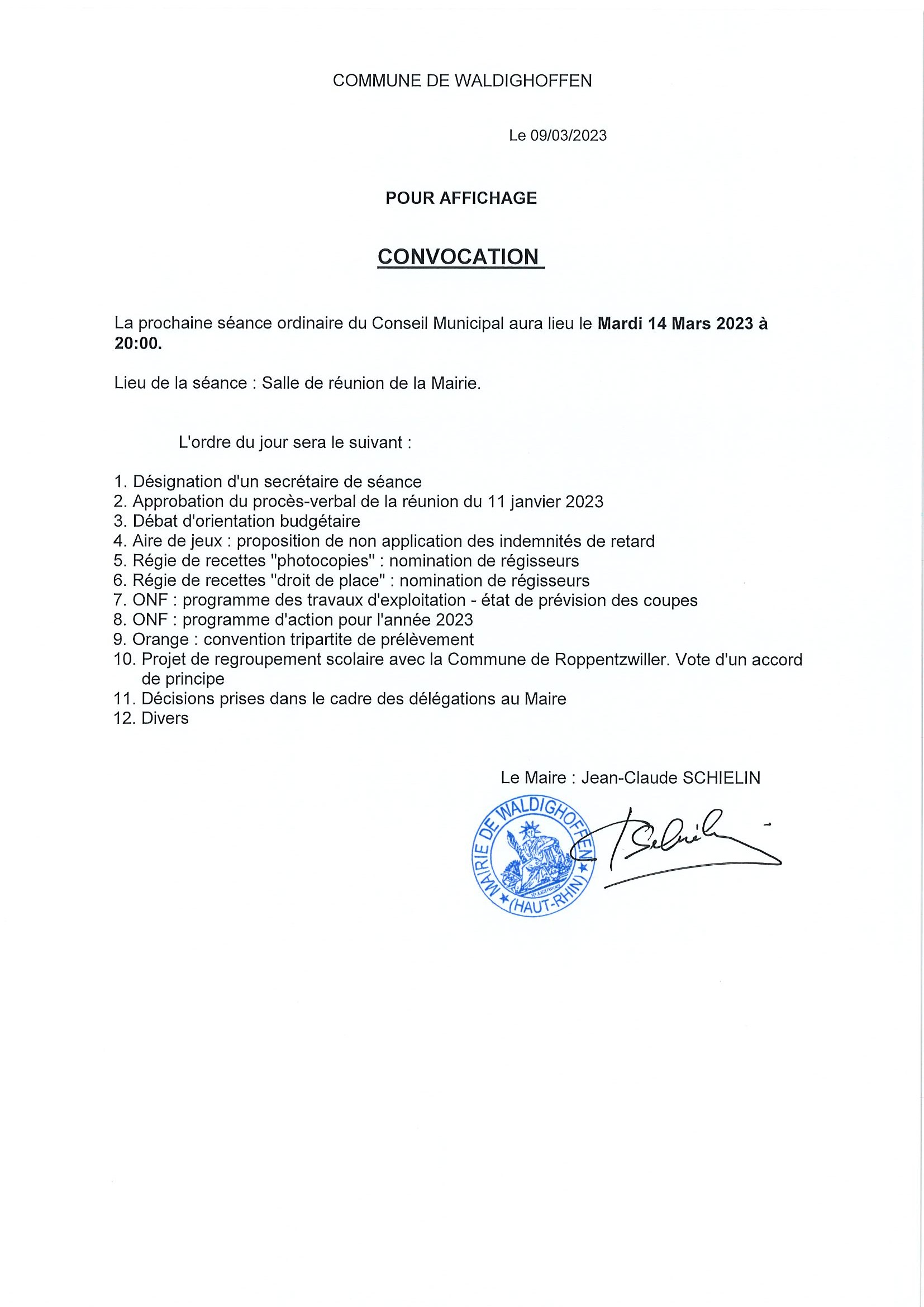 Convocation du conseil municipal à la réunion du 14 mars 2023