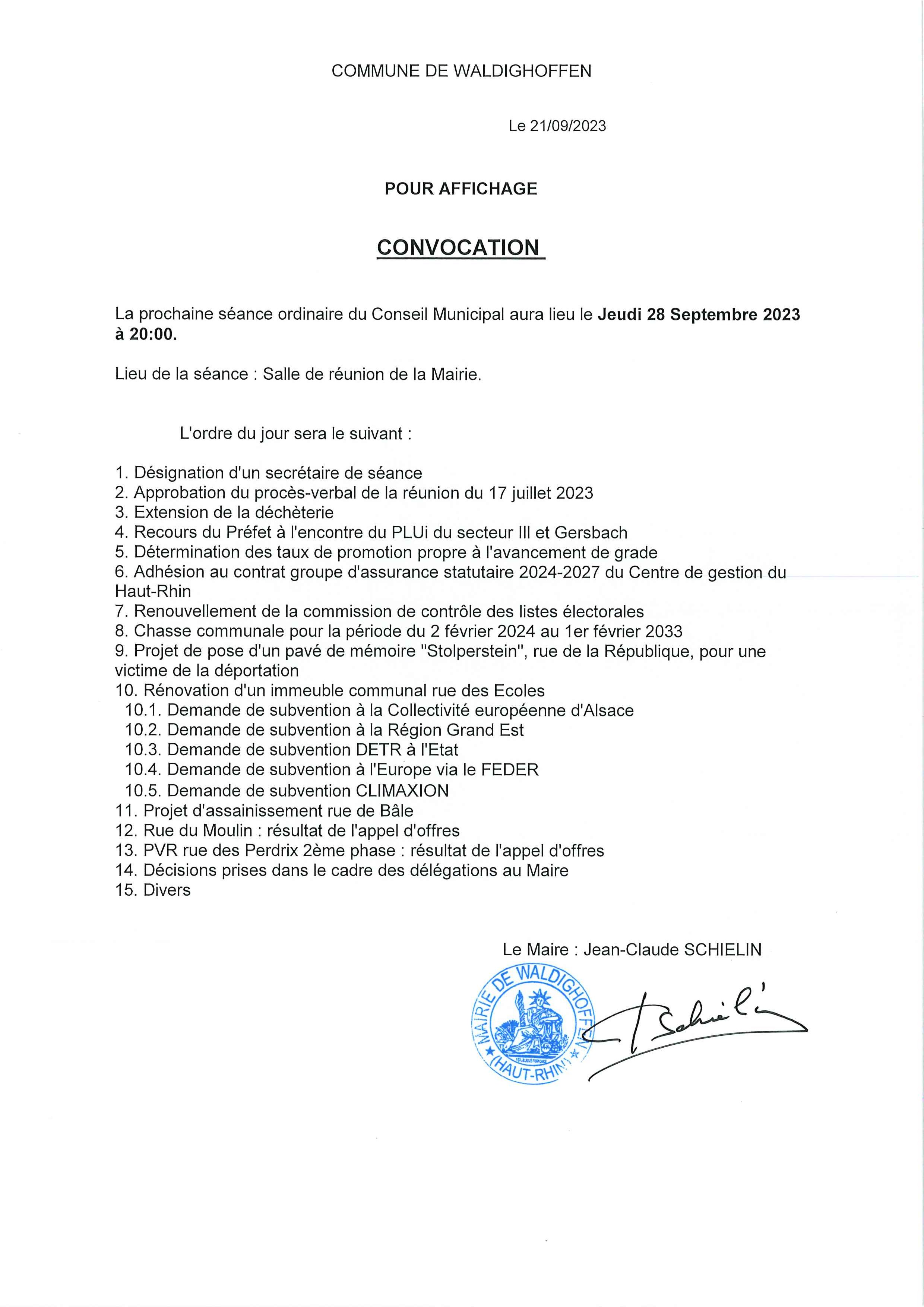 Convocation du conseil municipal à la réunion du 28/09/2023