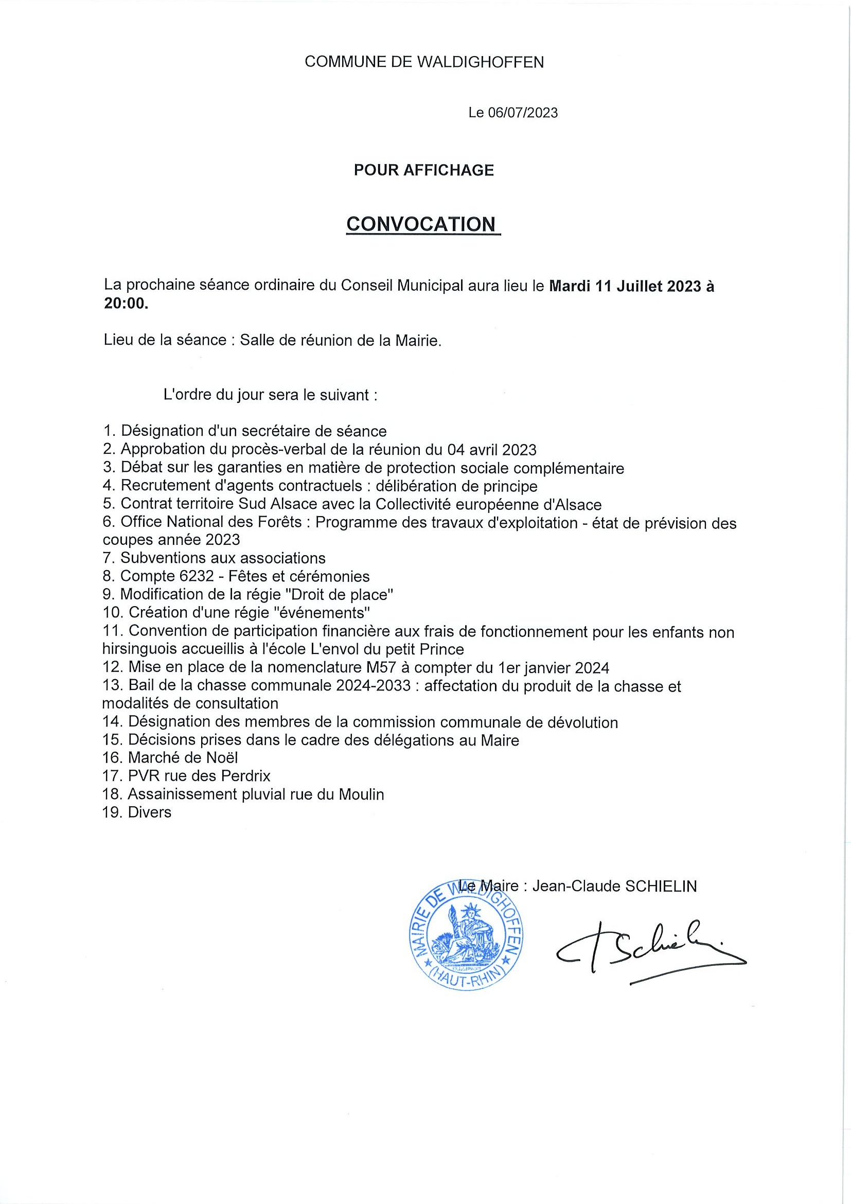 Vous êtes ici : Accueil Mairie Affichage public Annexes affichage public 2023 et 2024 Convocation du conseil municipal du 11/07/2023