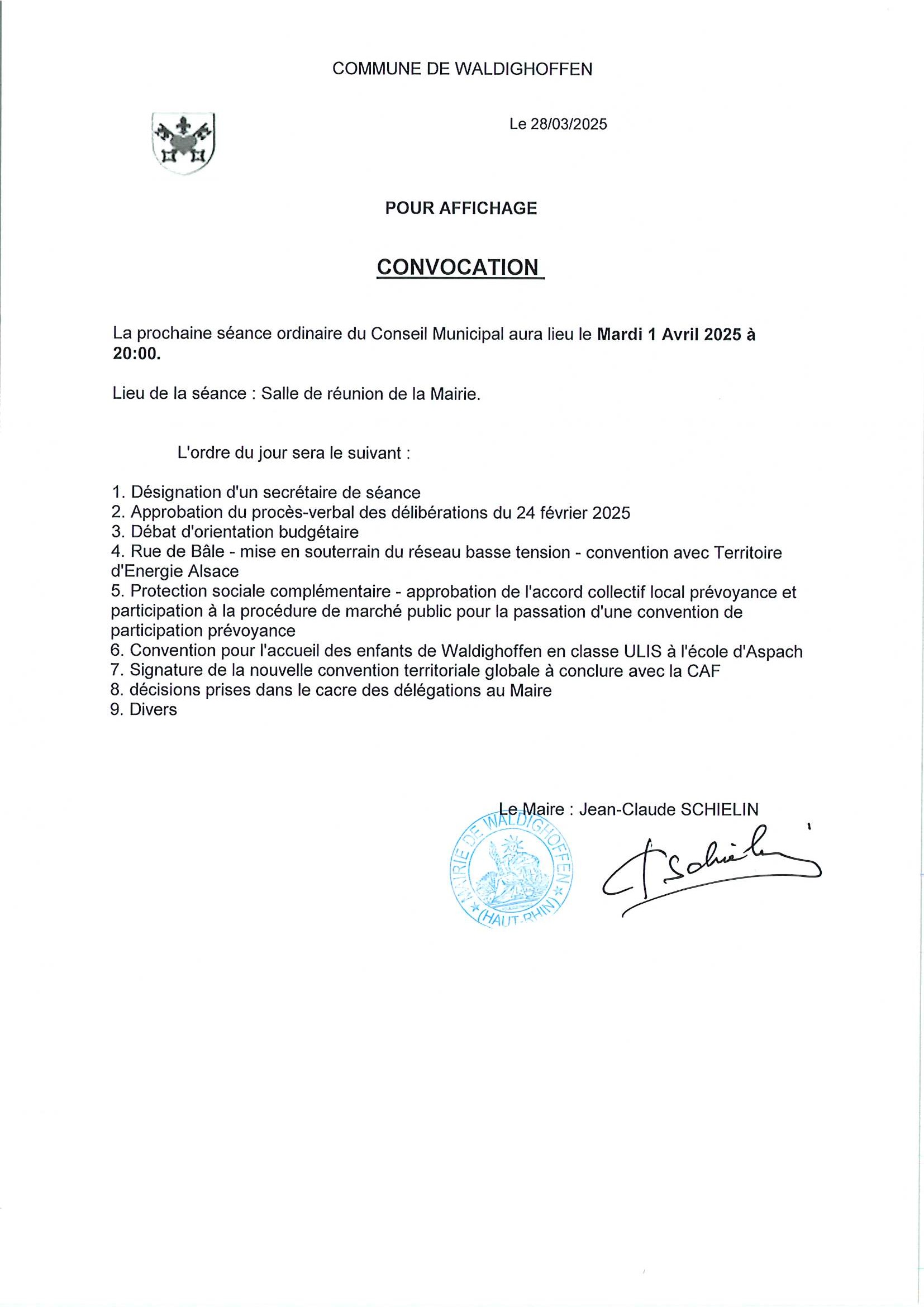 Vous êtes ici : Accueil Mairie Affichage public Annexes affichage public 2023 et 2024 Convocation du conseil municipal - réunion du 01/04/2025