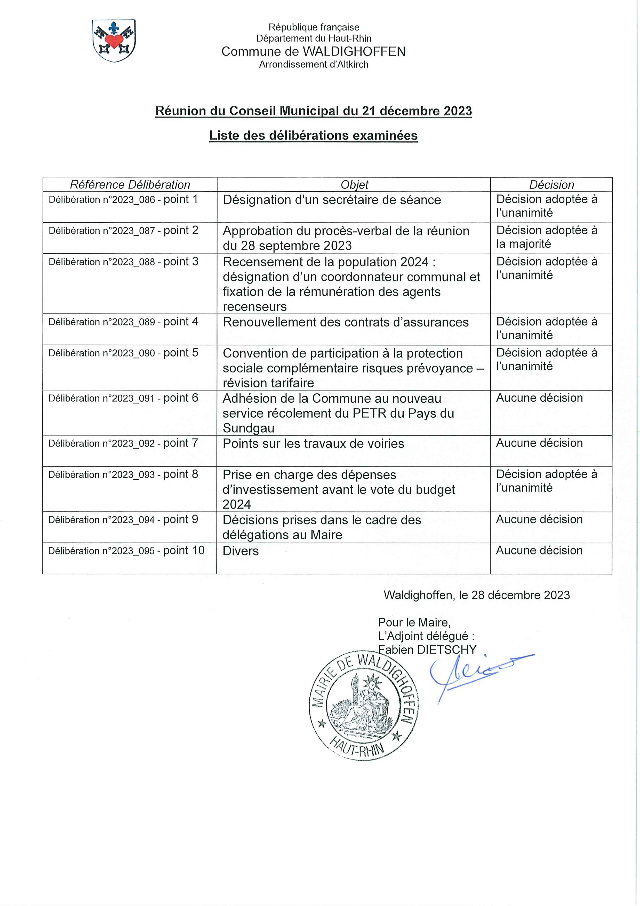 Vous êtes ici : Accueil Mairie Affichage public Annexes affichage public 2023 et 2024 Liste des délibérations de la réunion du 21/12/2023
