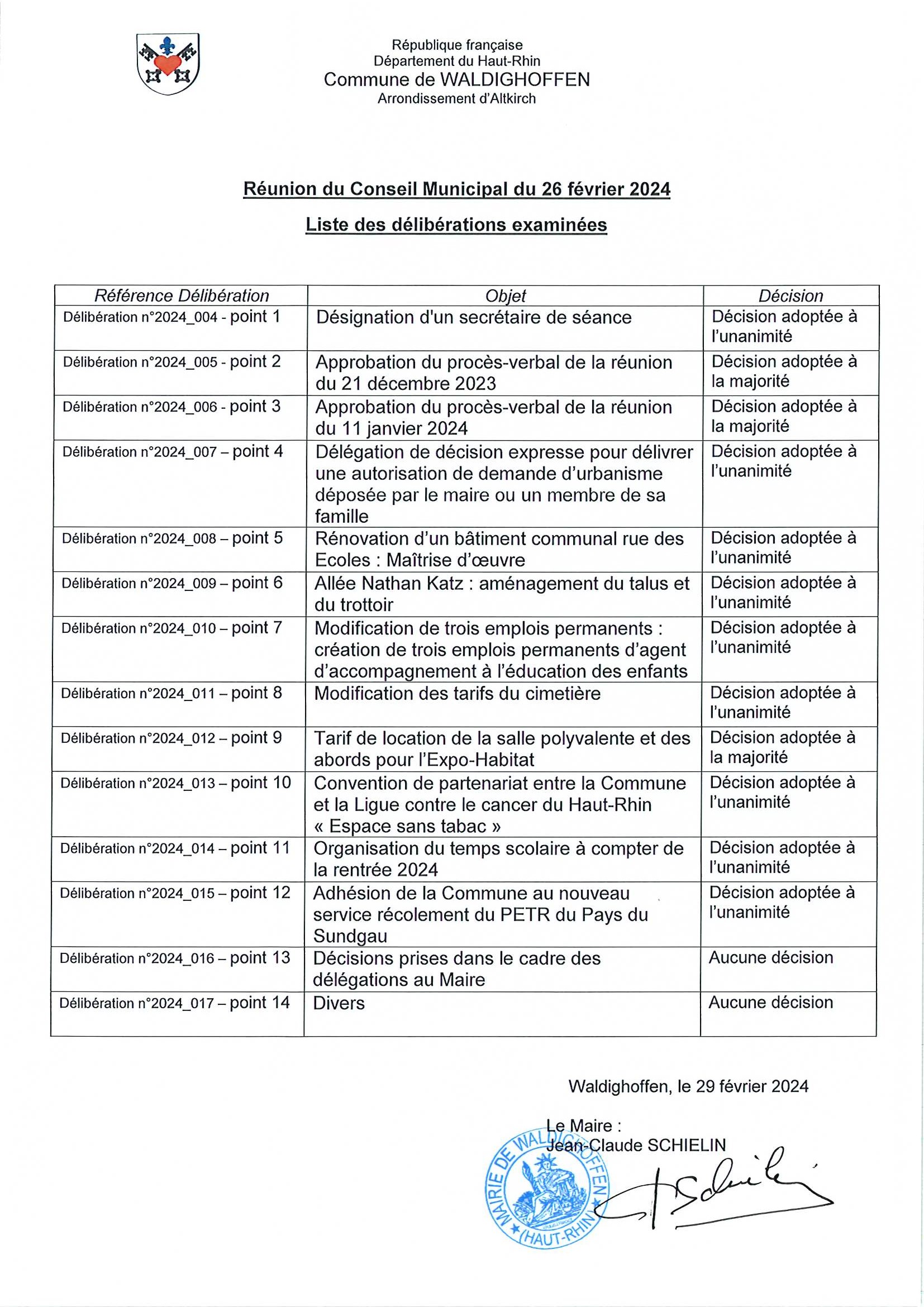 Liste des délibérations de la réunion du conseil municipal du 26.02.2024