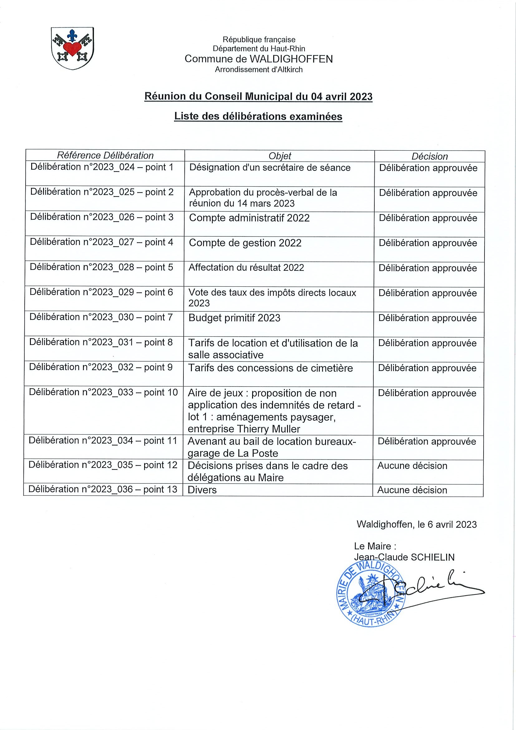 Liste des délibérations de la réunion du Conseil Municipal du 4 avril 2023