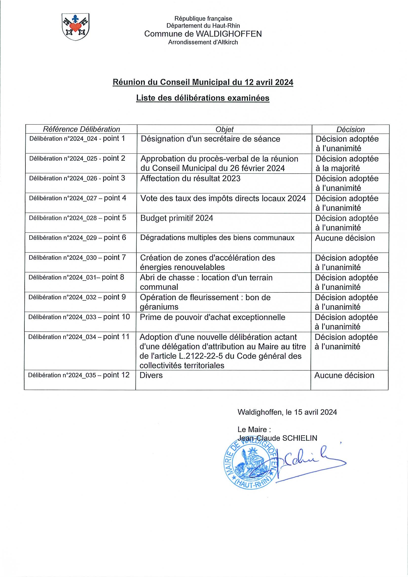 Vous êtes ici : Accueil Mairie Affichage public Annexes affichage public 2023 et 2024 Liste des délibérations du conseil municipal du 12/04/2024