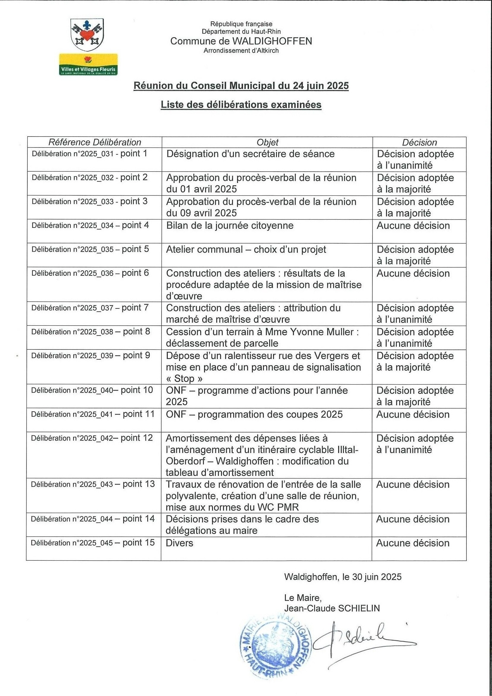 Liste des délibérations examinées par le conseil municipal le 24/06/2025
