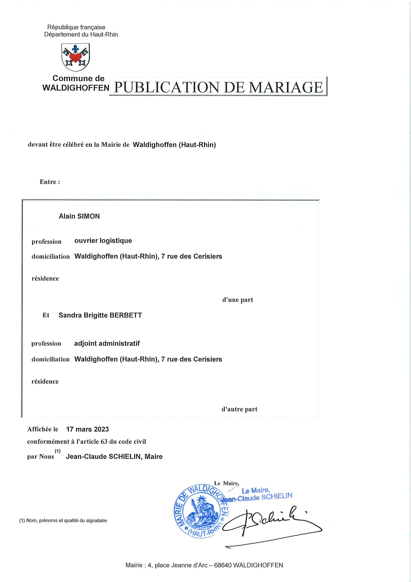 Publication du projet de mariage entre M. Simon Alain et Mme Berbett Sandra