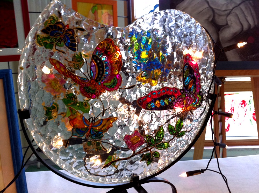 Des papillons sur un vase plat et de forme arrondie