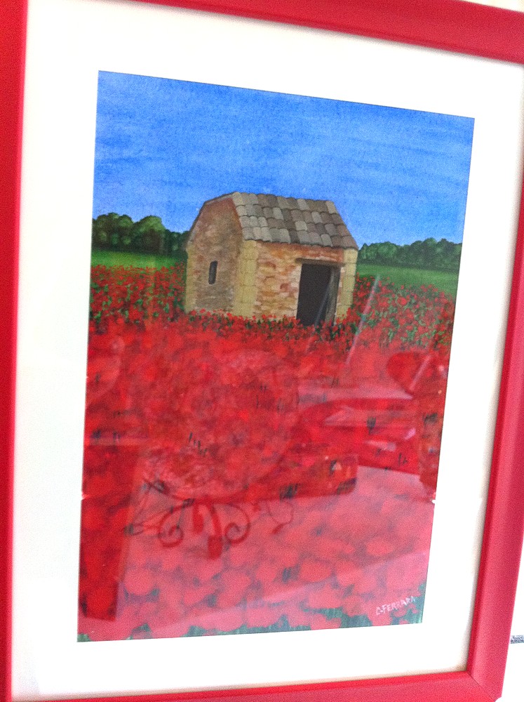 Tableau figuratif et coloré. Au fond le ciel bleu, puis la verdure et en premier plan, sur le 2/3 du tableau, le champ de coquelicots. La grange est posée au fond du champ