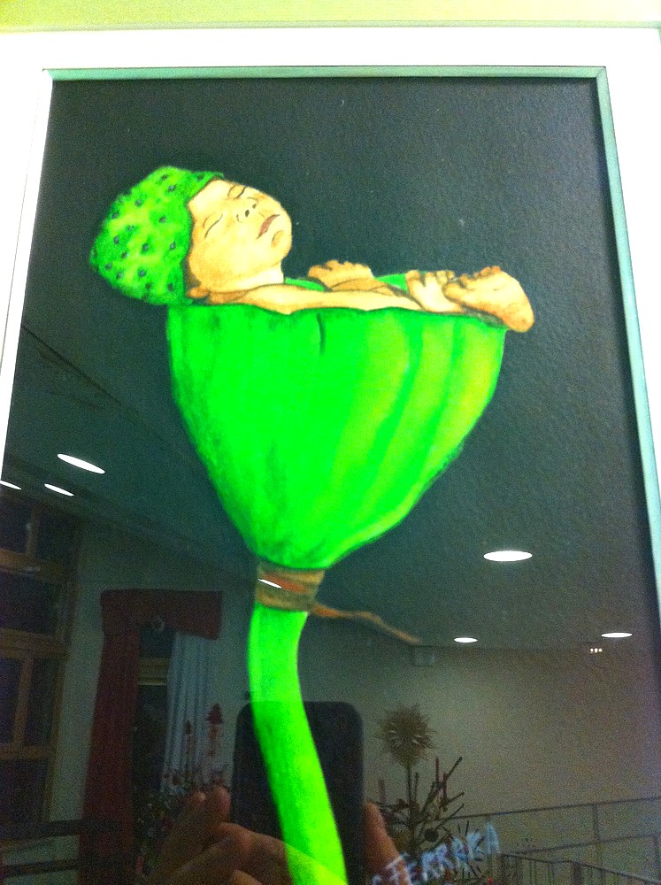 L'exposition et l'appareil photo se reflètent dans le tableau ! L'enfant dort dans la fleur, au sommet de la tige