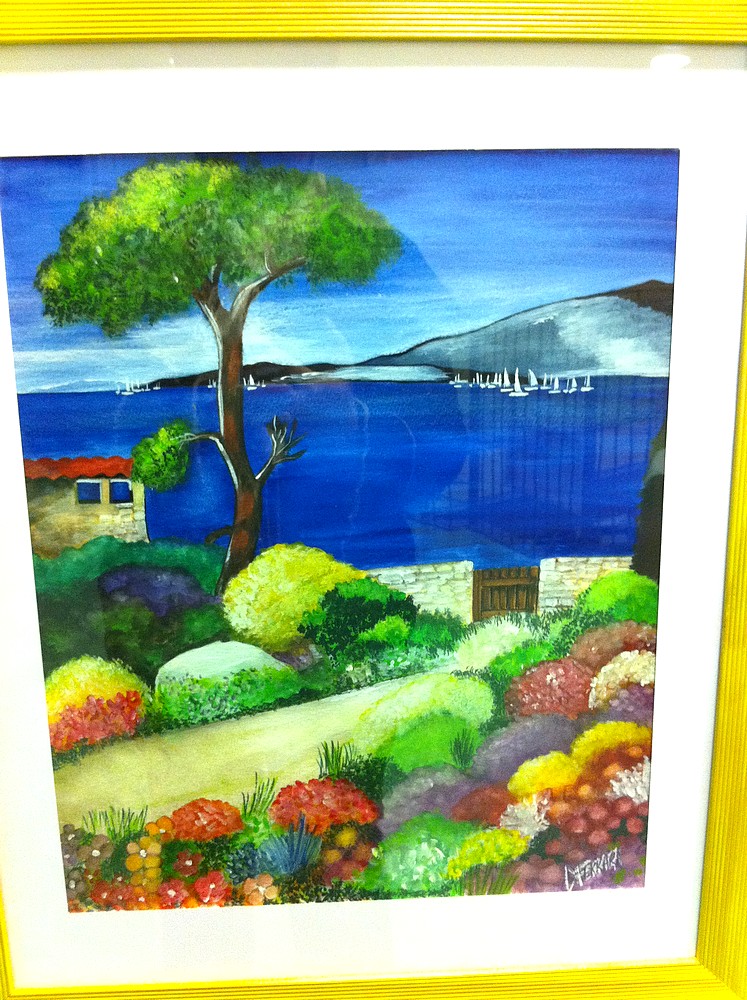 Beau tableau coloré : au 1er plan des touffes de plantes méditerranéennes, puis un pin parasol et la baie au loin avec ses voiliers