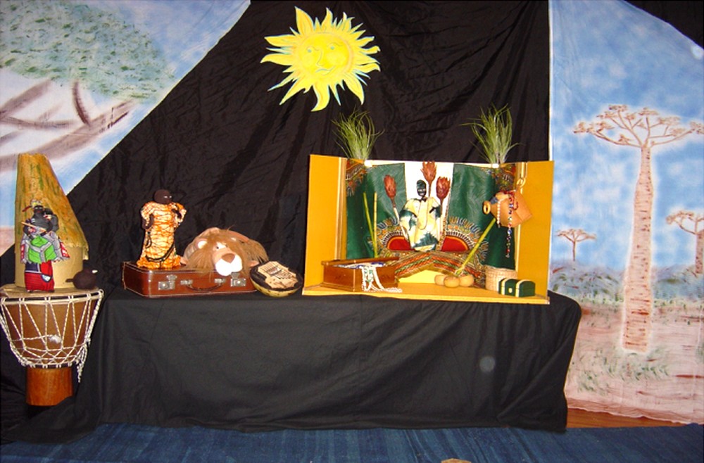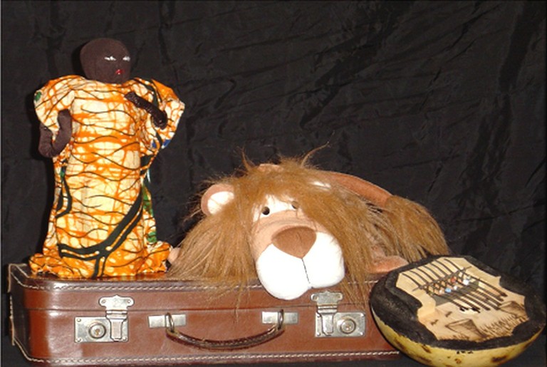 - Les accessoires pour le spectacle "Azukilé et le vieux lion" de Gaëlle Fratelli, des marionnettes, une valise,un instrument africain