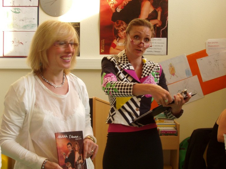 - La directrice de la Médiathèque Christiane Vallin et Gaëlle Fratelli, la comédienne qui joue le rôle hilarant de Marie-Chantal, présentent le livre "Ahhh, l'Amour"