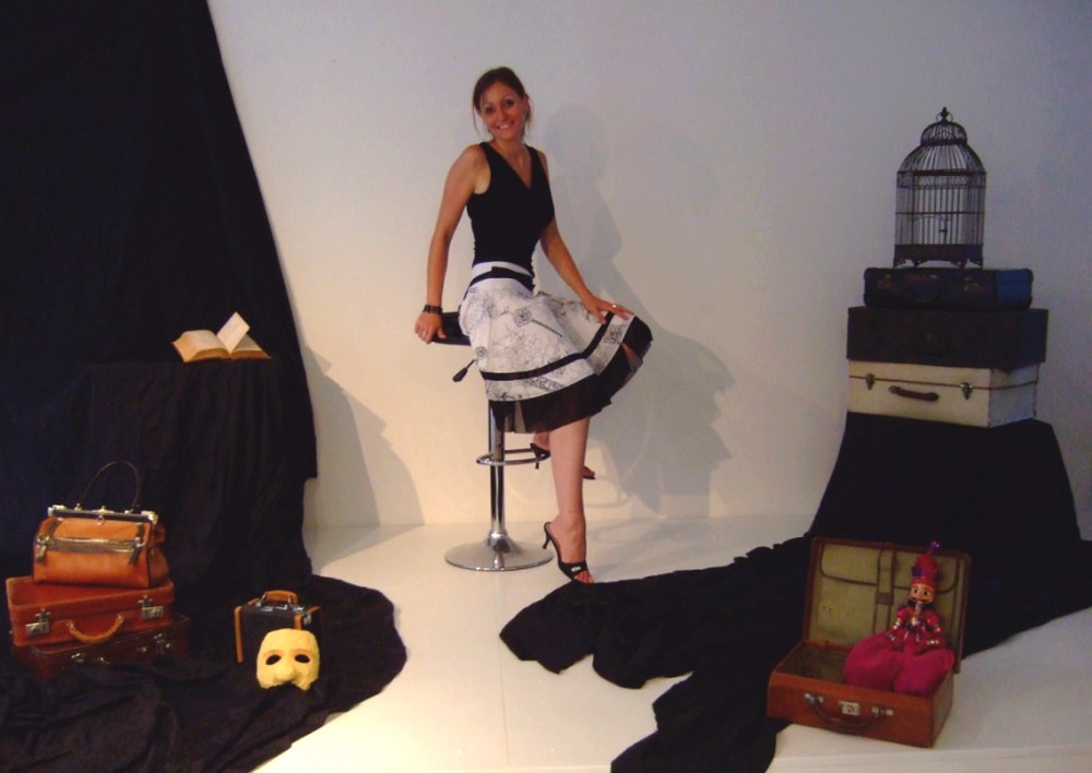 - Gaëlle Fratelli sur un tabouret avec des accessoires dont des valises et sacs et une cage
