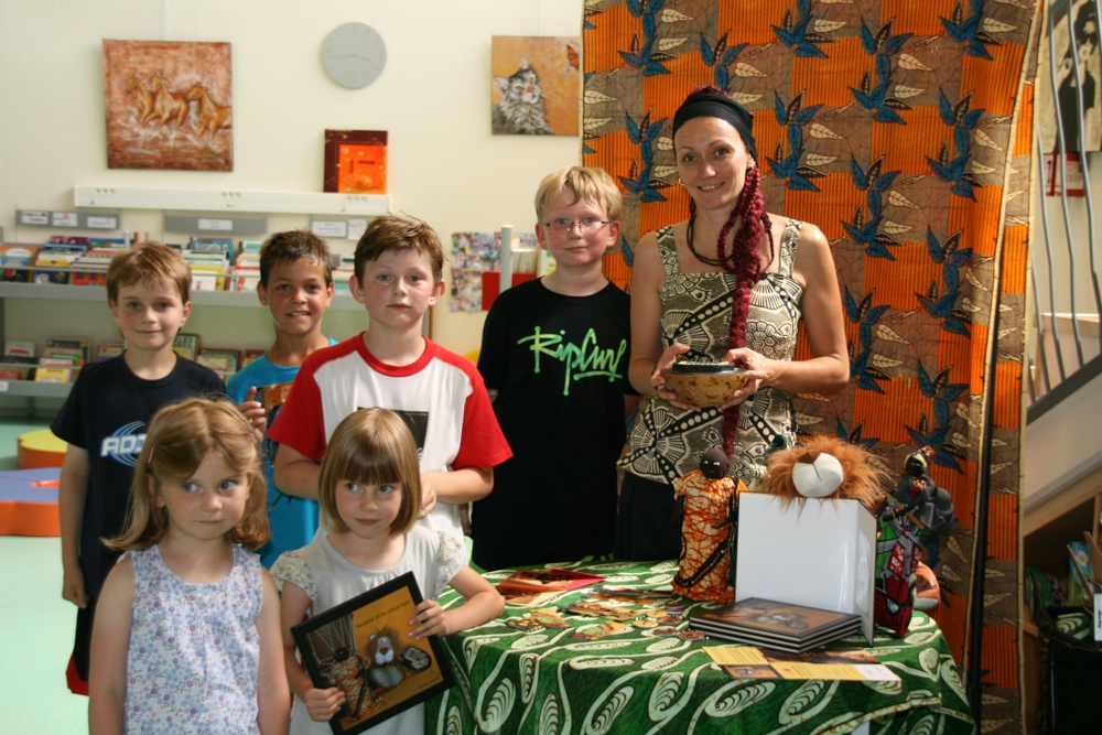 Gaëlle fratelli entourée des enfants de la médiathèque en l'honneur de son nouveau livre"Azukilé et le vieux lion"