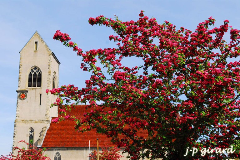 - Aubépine en fleurs sur la place Jeanne d'Arc à Waldighoffen, avec l'église Sts Pierre et Paul en arrière-plan.