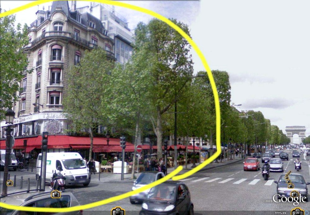 A gauche la façade de la Maison de l'Alsace, au fond, l'arc de triomphe de l'Etoile