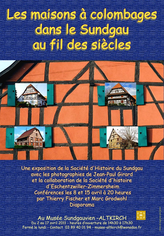 Les maisons à colombages dans le Sundgau au fil des siècles. Affiche de l'expo par JP Girard (une maison à colombage avec d'autres maisons dans les fenêtres)