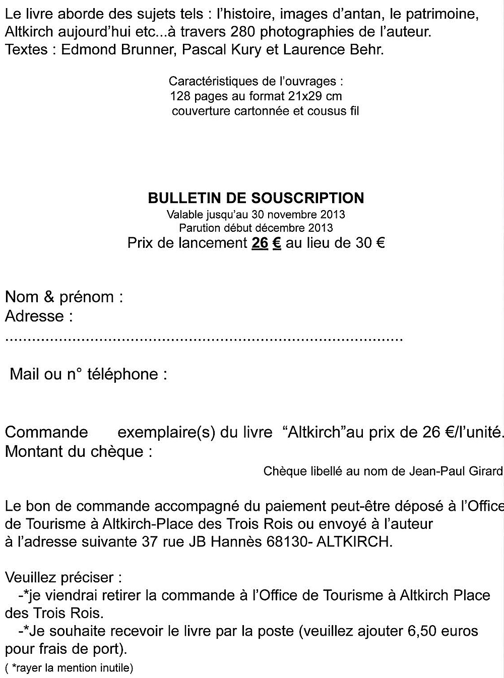 Bulletin de souscription pour "Altkirch, la capitale du Sundgau", livre de photos de JP Girard, textes de Edmond Brunner, Pascal Kury et Laurence Behr