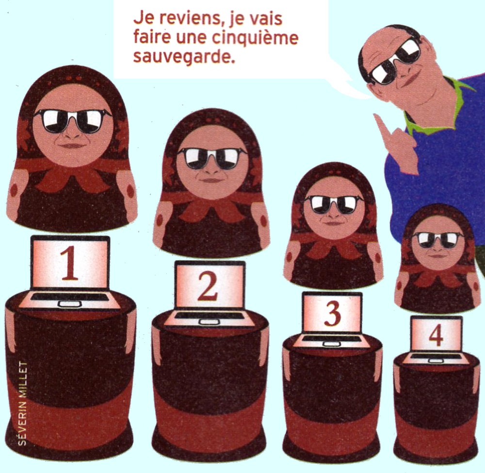 Image Maif Magazine (Séverin Millet). Un homme, en présence de 4 poupées russes contenant des ordinateurs, dit "Je reviens, je vais faire une 5e sauvegarde"