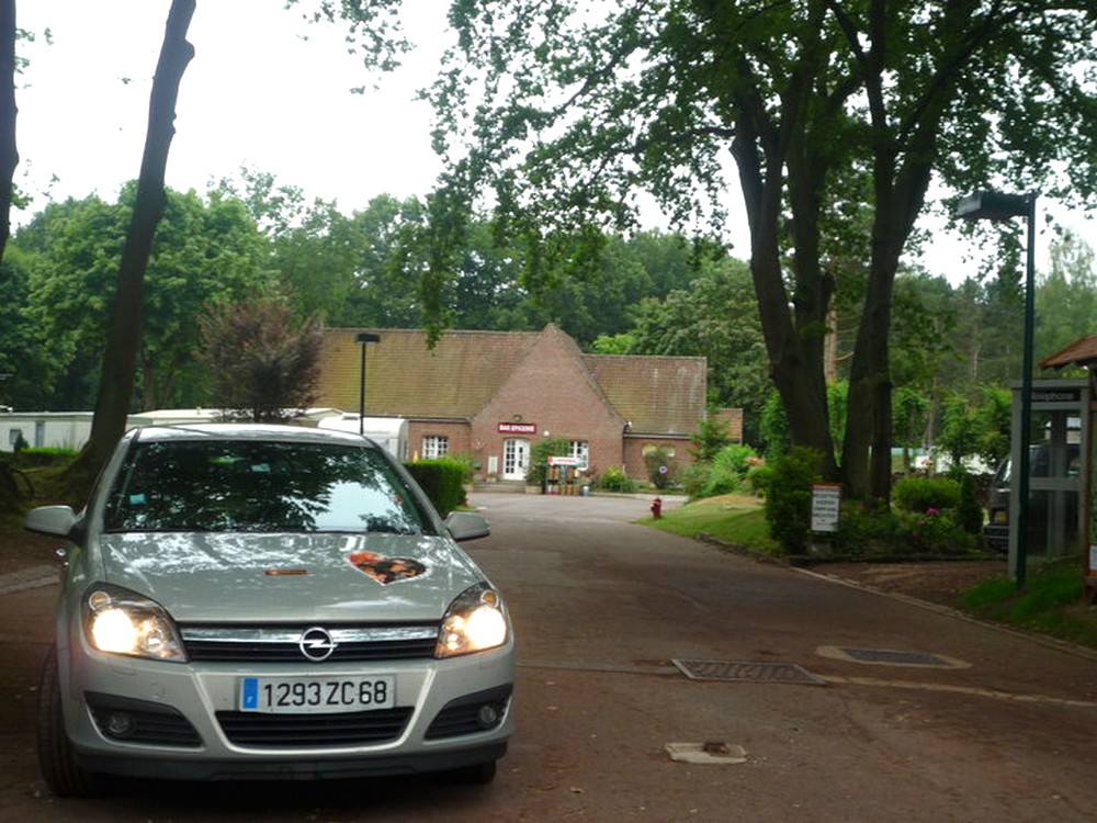 La voiture de Kathya près de l'entrée du camping du Bois d'amour, qui et aussi un gîte, à St Amand les Eaux