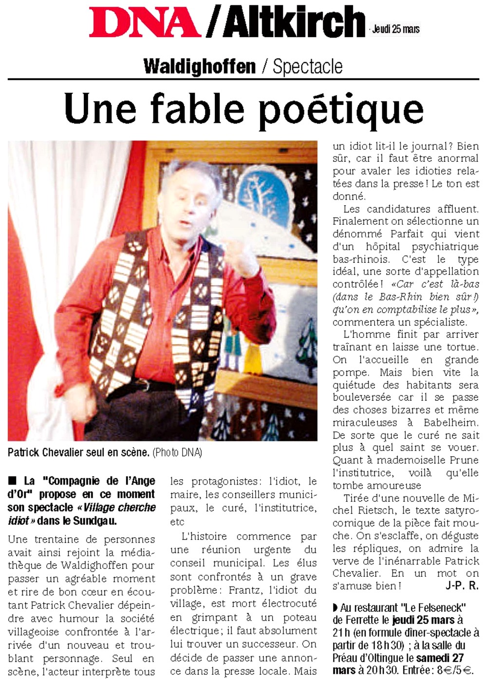 J.P.Roth a signé l'article suivant dans les DNA du 25 mars 2010, pour la soirée du 23 mars à la médiathèque de Waldighoffen