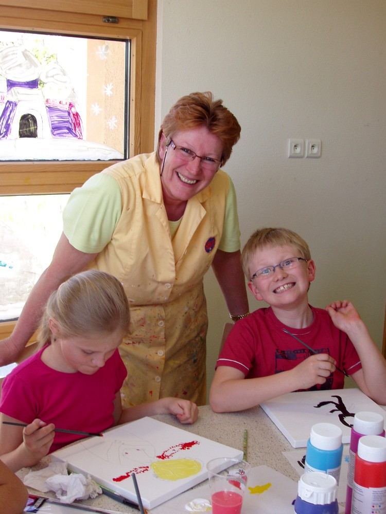 Les joies de la peinture avec la peintre et deux enfants du groupe.