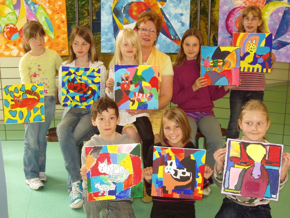 Le groupe des enfants avec leurs oeuvres au terme de l'atelier-peinture avec Christiane Demuth à la médiathèque de Waldighoffen