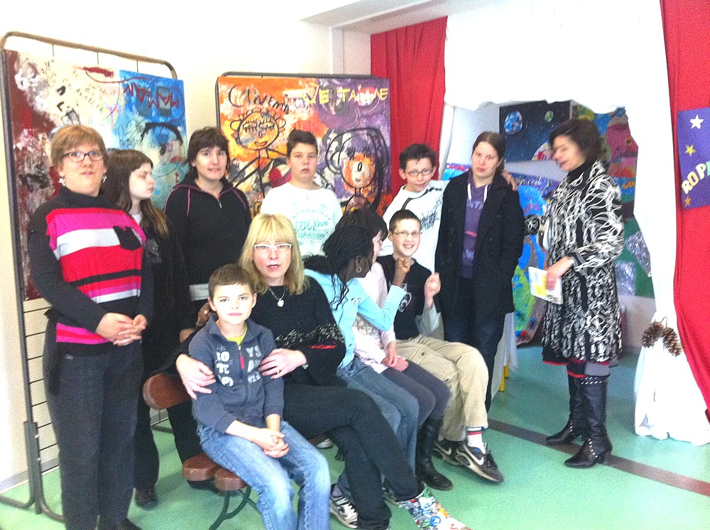 Les artistes de l'IME avec une animatrice et Christiane Vallin
