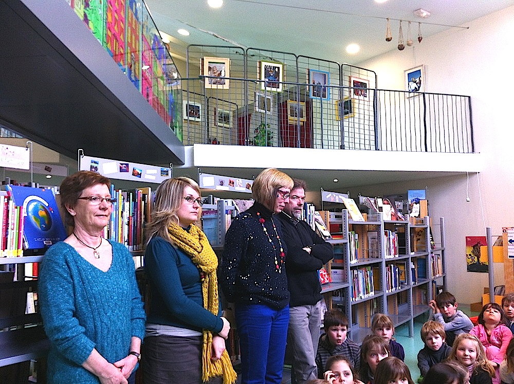 De gauche à droite, l'adjointe Evelyne Herrmann, la directrice de l'école Delphine Roch, celle de la médiathèque Christiane Vallin et Jean-Pierre Kleitz qui remplace Mme Vonau