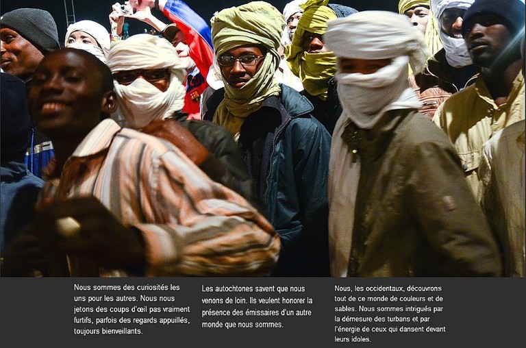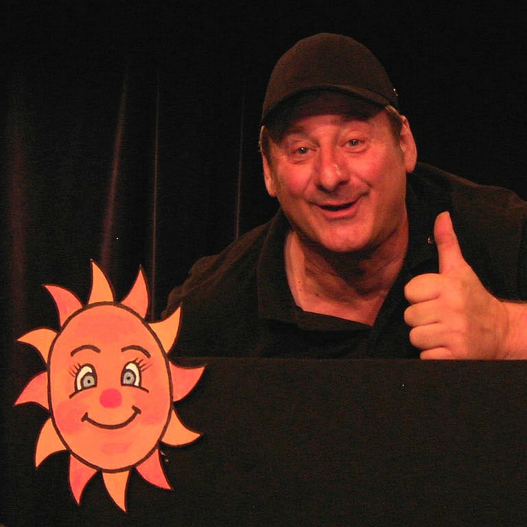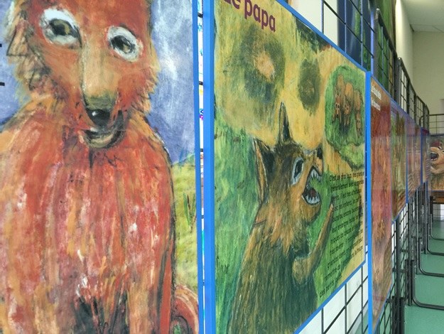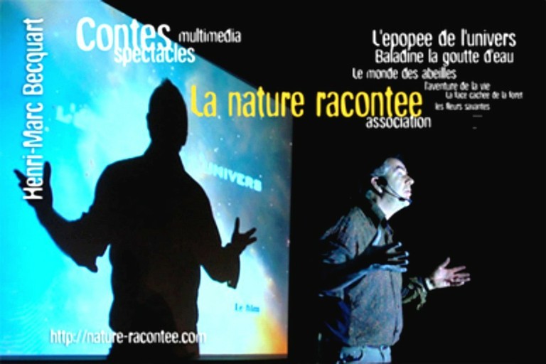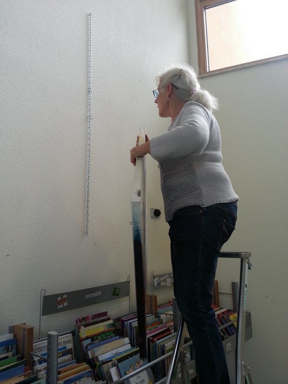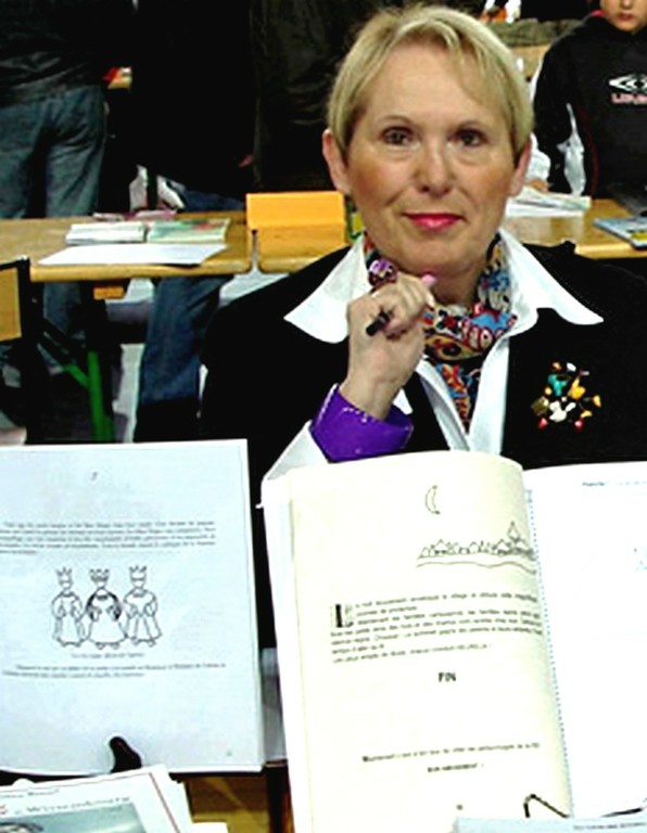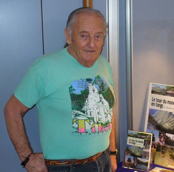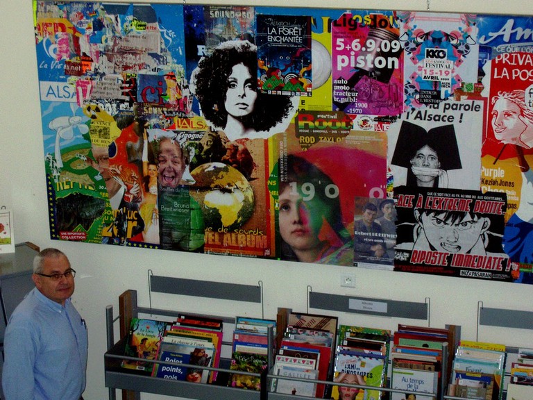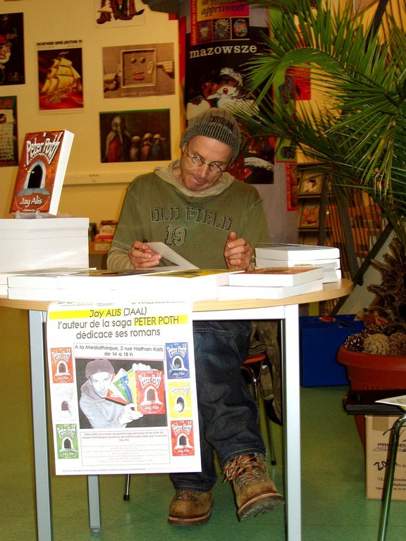 - Photo de Patrick Chevalier montrant le village du doigt derrière le photographe d'un air émerveillé lors d'une scène à la Médiathèque de Waldighoffen.