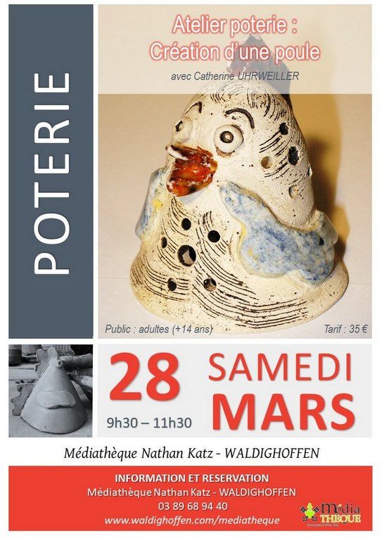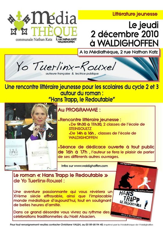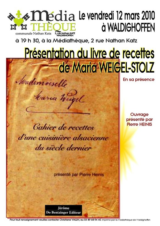 - Affiche présentant la soirée de dédicace du livre de cuisine de Maria Stolz-Weigel le vendredi 12 mars à 19 h 30 à la médiathèque de Waldighoffen