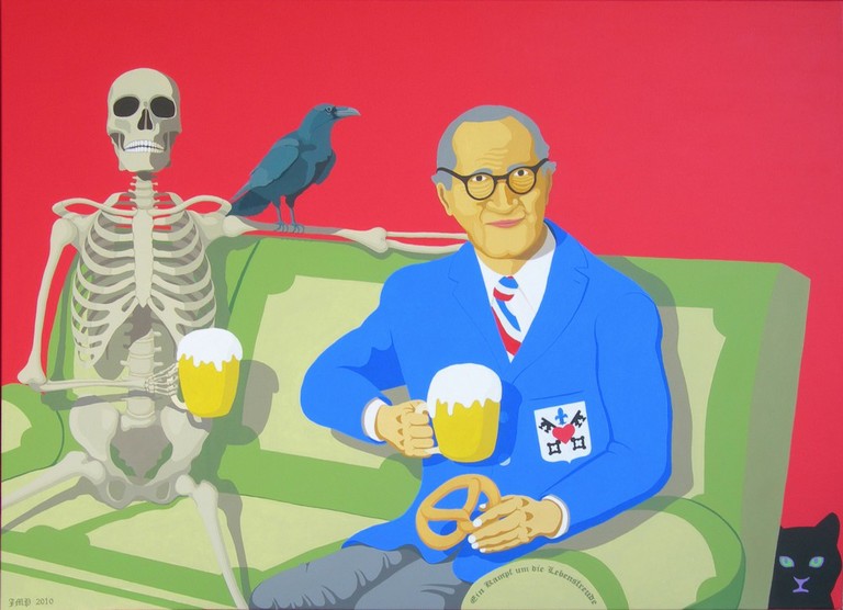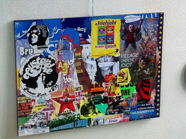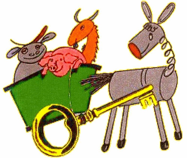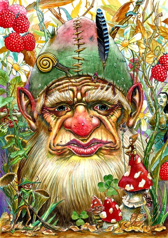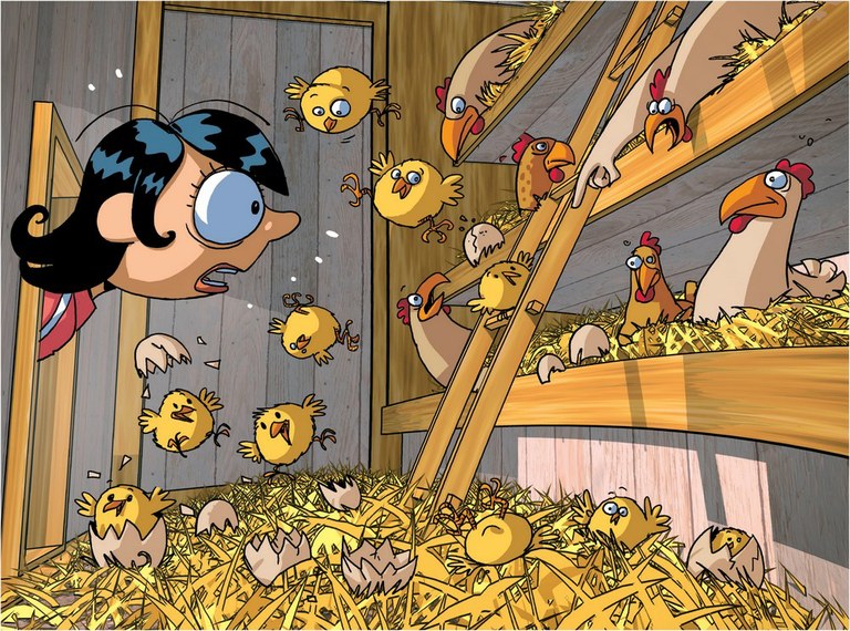- Affiche pour le conte " Village cherche Idiot " représentant le village de Balbelheim avec Patrick Chevalier volant dans les airs.