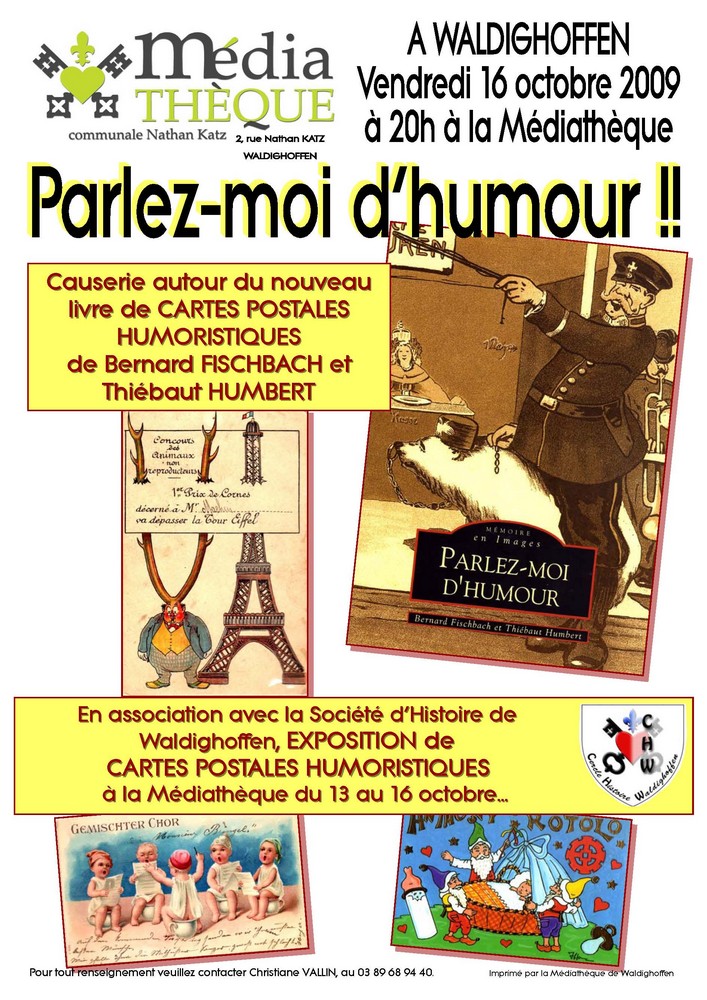 La Médiathèque de Waldighoffen, avec le Cercle d'Histoire, présente une causerie autour du nouveau livres de cartes postales humoristiques de Bernard FISCHBACH et Thiébaut HUMBERT.