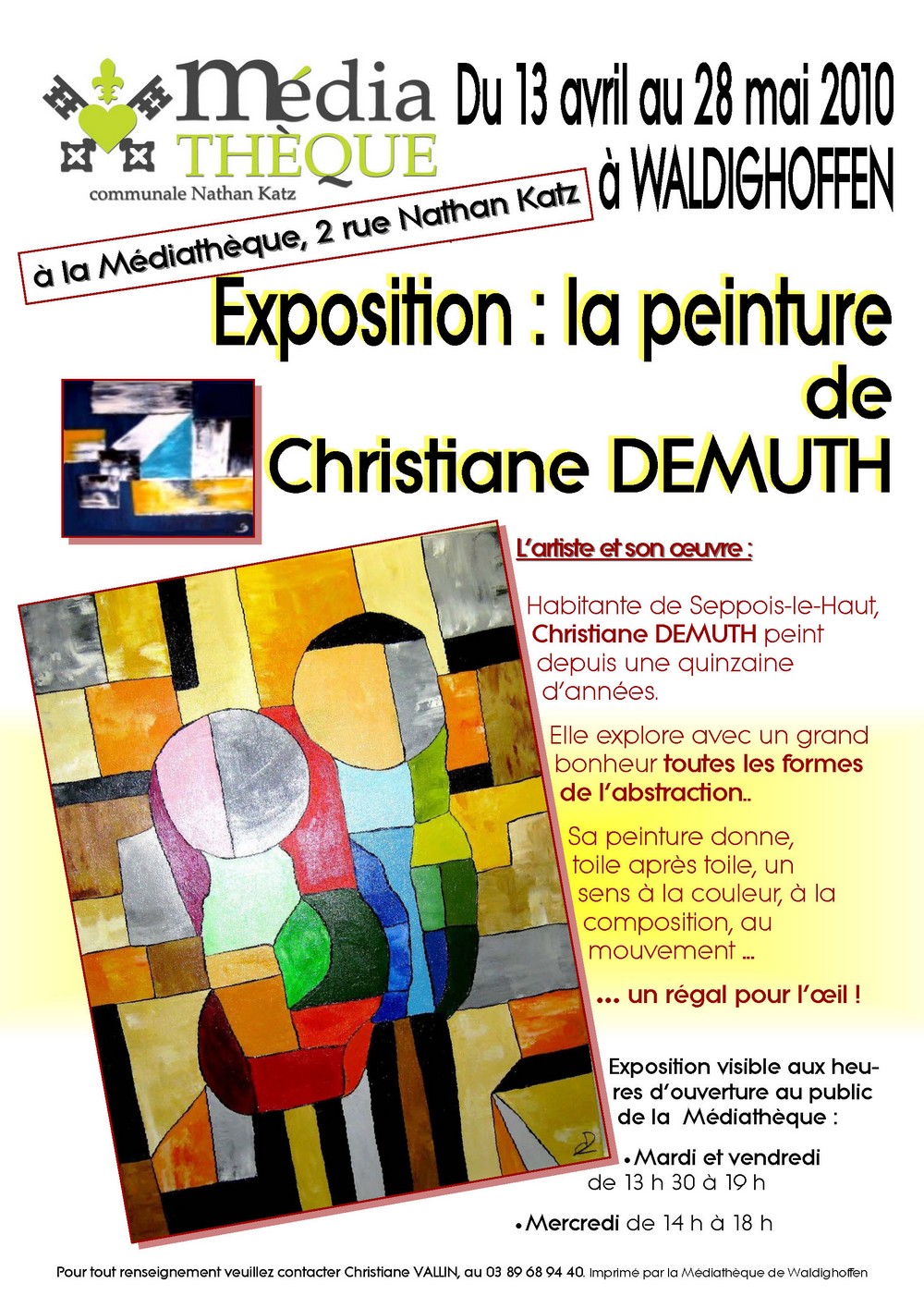Christiane DEMUTH expose ses oeuvres à la Médiathèque de Waldighoffen du mardi 13 avril au vendredi 28 mai 2010. Voici l'affiche de cette expo.
