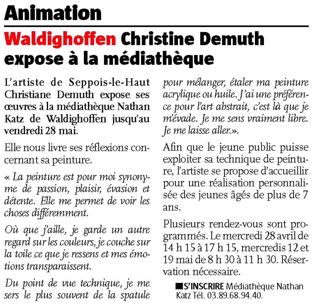 Dans l'Alsace du 21 avril 2010, un article sur l'exposition et les ateliers de Christiane demuth