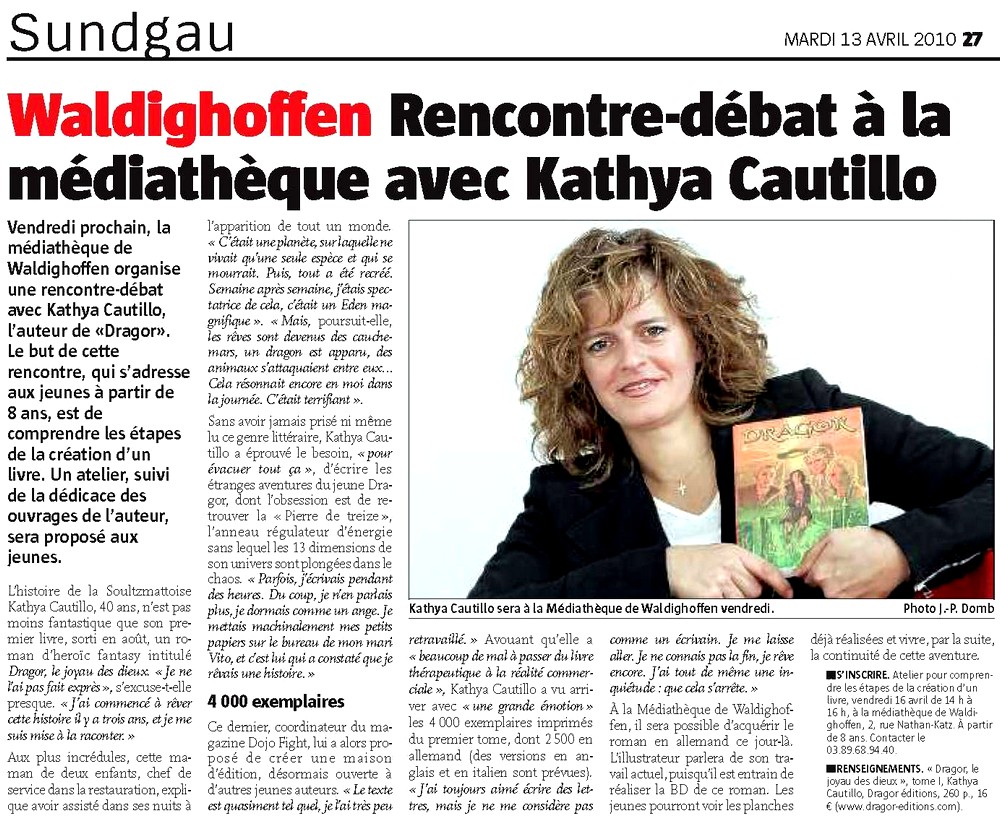 L'auteur de DRAGOR sera à la médiathèque de Waldighoffen le 16 avril 2010. Le journal l'Alsace en fait état ce mardi 13 avril 2010.
