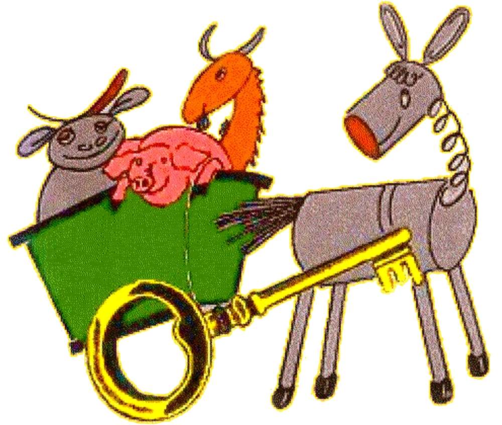 Logo de l'Association "La Clé des Champs"de Bouxwiller (ferme pédagogique), une charrette tirée par un âne-robot chargée de différents animaux,dont les roues sont une clé.
