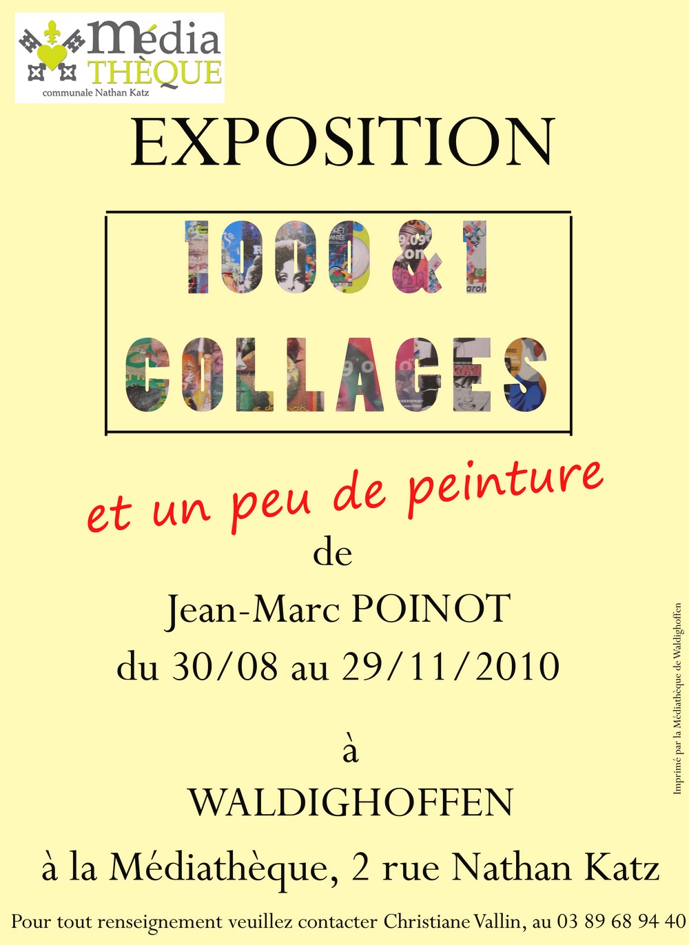 Jean-Marc POINOT fait des collages à partir d'affiches décollées des murs et des panneaux. Voici l'affiche de son expo du 30 août au 29 novembre 2010 à la médiathèque de Waldighoffen