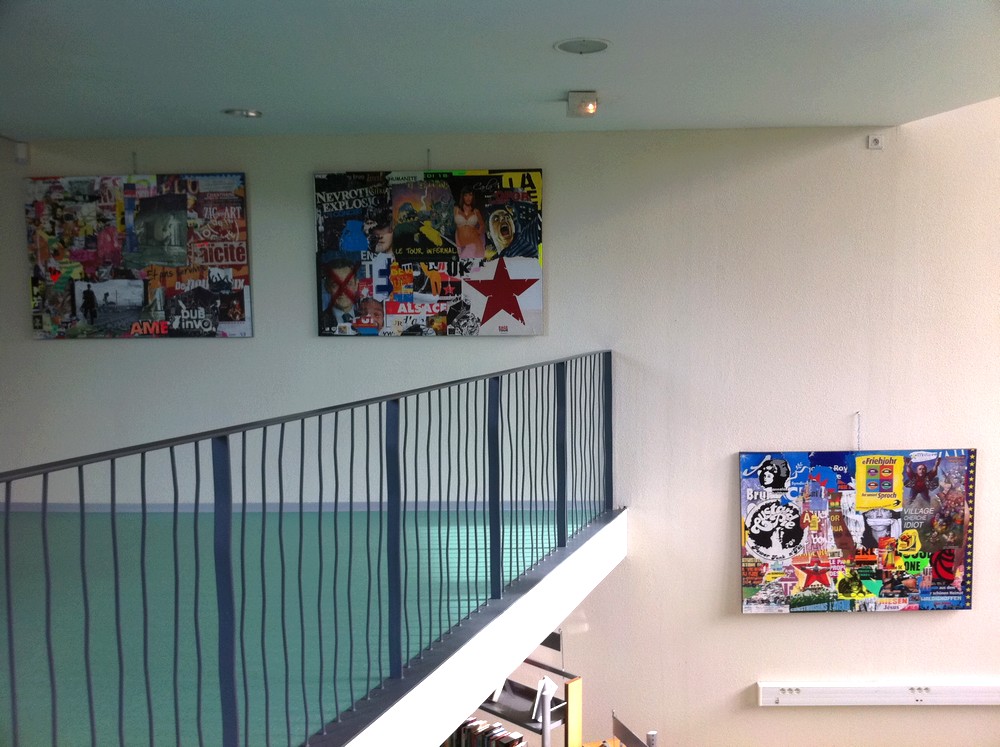 Accrochage de collages de Jean-Marc Poinot à la Médiathèque de Waldighoffen