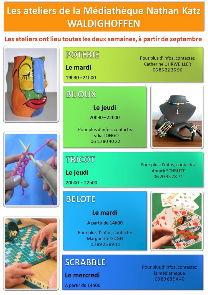 Affiche pour les ateliers 2014/2015 à la Médathèque : tricot, poterie, bijoux, belote, scrabble