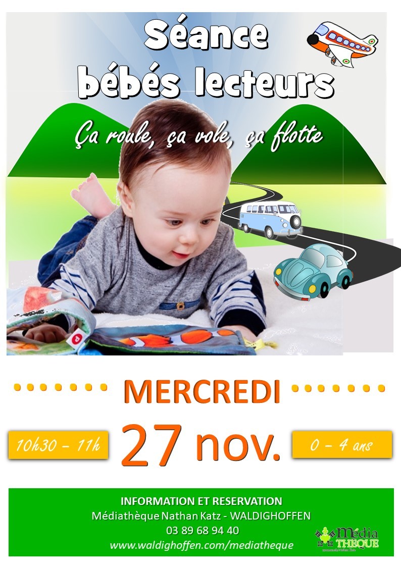 Affiche de la séance bébés lecteurs du mois de novembre 2019 : ça roule, ça vole, ça flotte