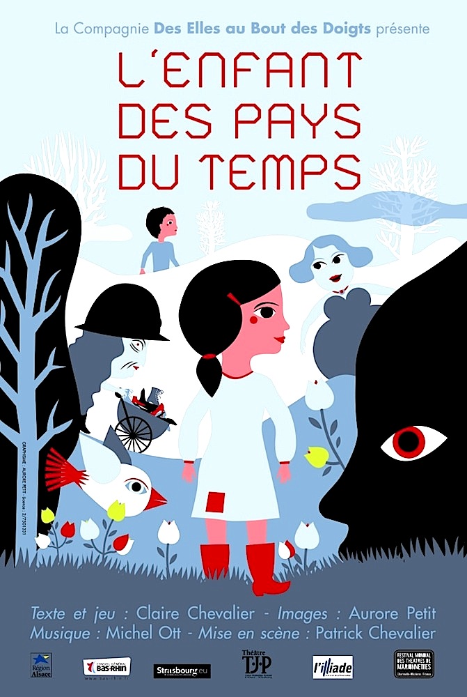 Affiche sur fond bleu avec le titre "L'enfant des pays du temps" et un dessin stylisé d'une petite fille dans un pré avec d'autres personnages.