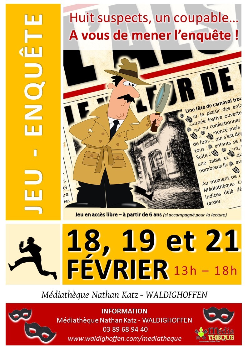 Affiche pour l'animation "Enquête à la Médiathèque" du mois de février 2020.