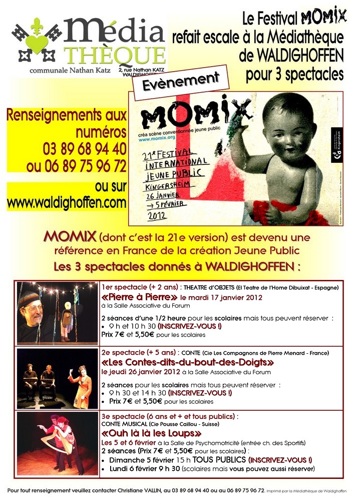 Affiche créée par la Médiathèque Nathan Katz de Waldighoffen pour présenter les 3 spectacles Momix qui y seront données en janvier et février 2012