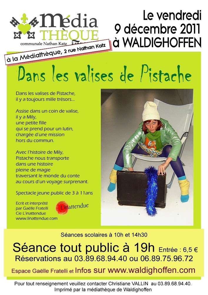 Affiche présentant la prestation de Gaëlle Fratelli le 9 décembre 2011 à la médiathèque de Waldighoffen : Dans les valises de Pistache